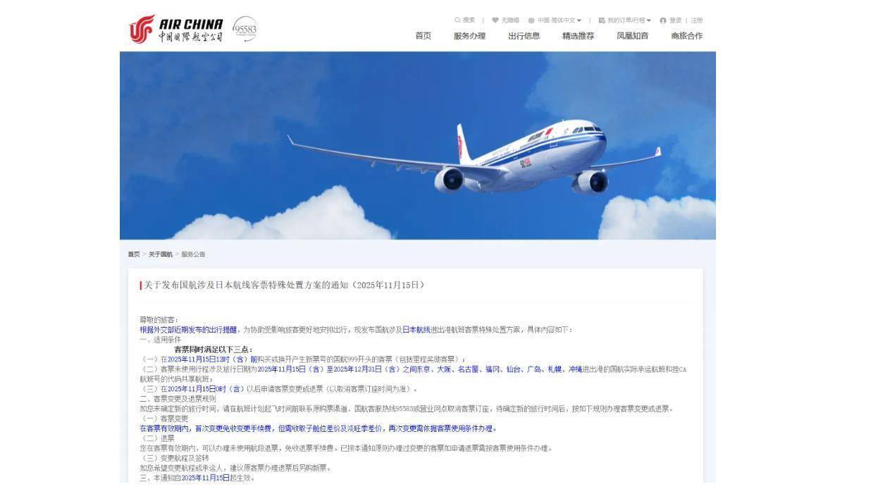 其中,国航在通知中明确,对于在今年11月15日12时(含)前购买或换开产生新票号的国航999开头的客票(包括里程奖励客票);客票未使用行程涉及旅行日期为2025年11月15日(含)至2025年12月31日(含)之间东京、大阪、名古屋、福冈、仙台、广岛、札幌、冲绳进出港的国航实际承运航班和挂CA航班号的代码共享航班;在2025年11月15日0时(含)以后申请客票变更或退票(以取消客票订座时间为准)。在客票有效期内,首次变更免收变更手续费,但需收取子舱位差价及淡旺季差价,再次变更需依据客票使用条件办理。在客票有效期内,可以办理未使用航段退票,免收退票手续费。