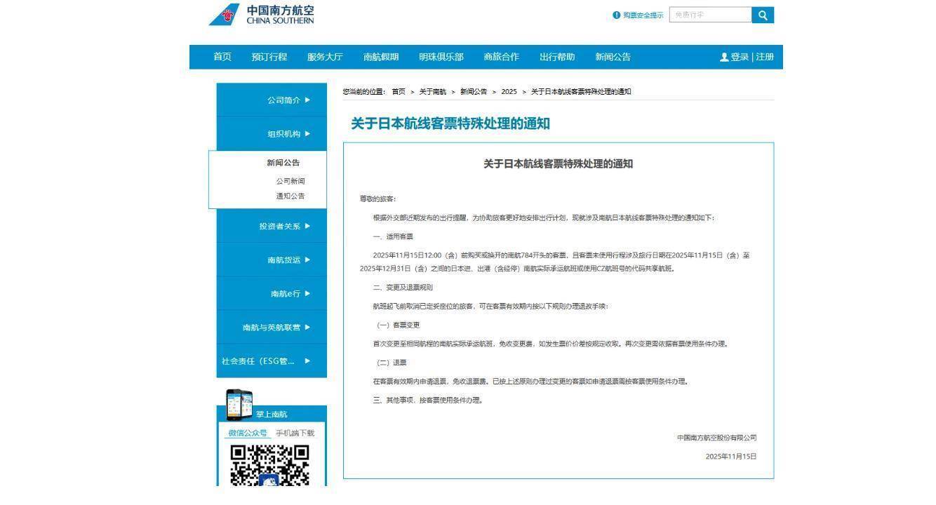 南航在通知中明确,对于在今年11月15日12:00(含)前购买或换开的南航784开头的客票,且客票未使用行程涉及旅行日期在2025年11月15日(含)至2025年12月31日(含)之间的日本进、出港(含经停)南航实际承运航班或使用CZ航班号的代码共享航班,航班起飞前取消已定妥座位的旅客,在客票有效期内申请退票,免收退票费。首次变更至相同航程的南航实际承运航班,免收变更费,如发生票价价差按规定收取。
