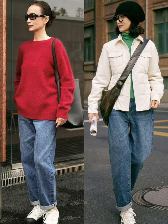 更不要说中年女性了,人到中年身体的新陈代谢容易变得缓慢,腰间会堆积赘肉,胯宽腿粗,这时候应该直接选择设计留有余量的藏蓝色针织开衫,搭配上白色的阔腿裤,这样的冬裤遮肉显瘦。