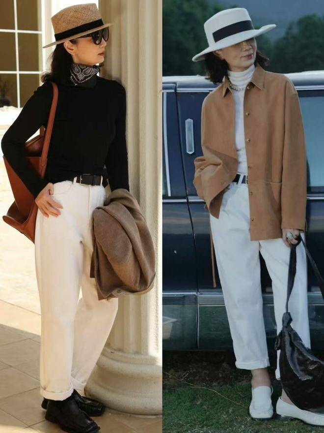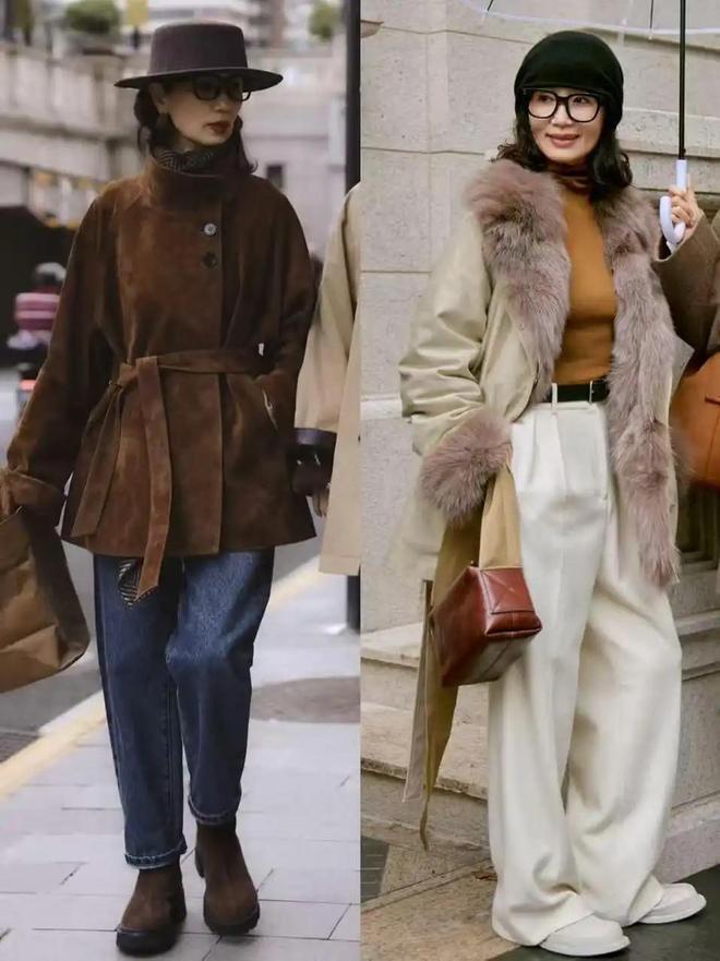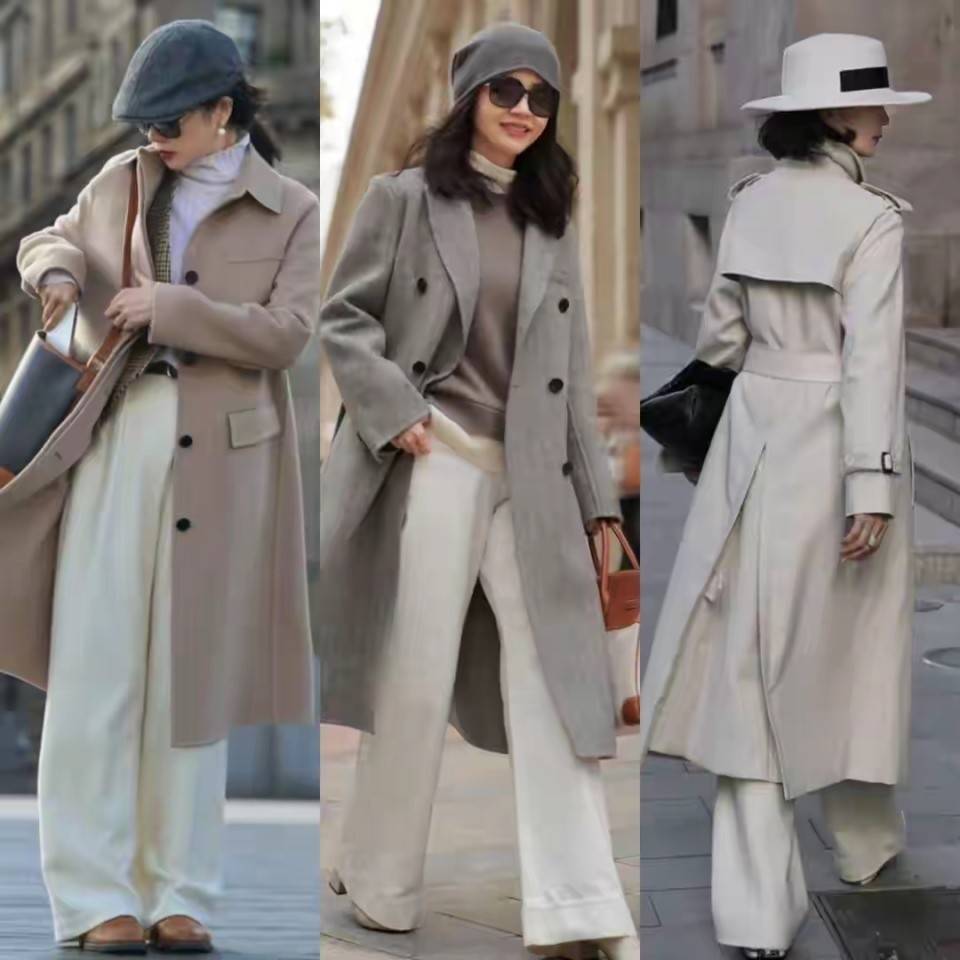 如上面“三木博主”选择了一件灰色大衣内搭针织衫,加上一条白色的直筒阔腿裤,或者是她妈妈选择了卡其色的风衣,搭配上白色的阔腿长裤,这2套色彩搭配非常的清楚,但一点也不失高级感。
