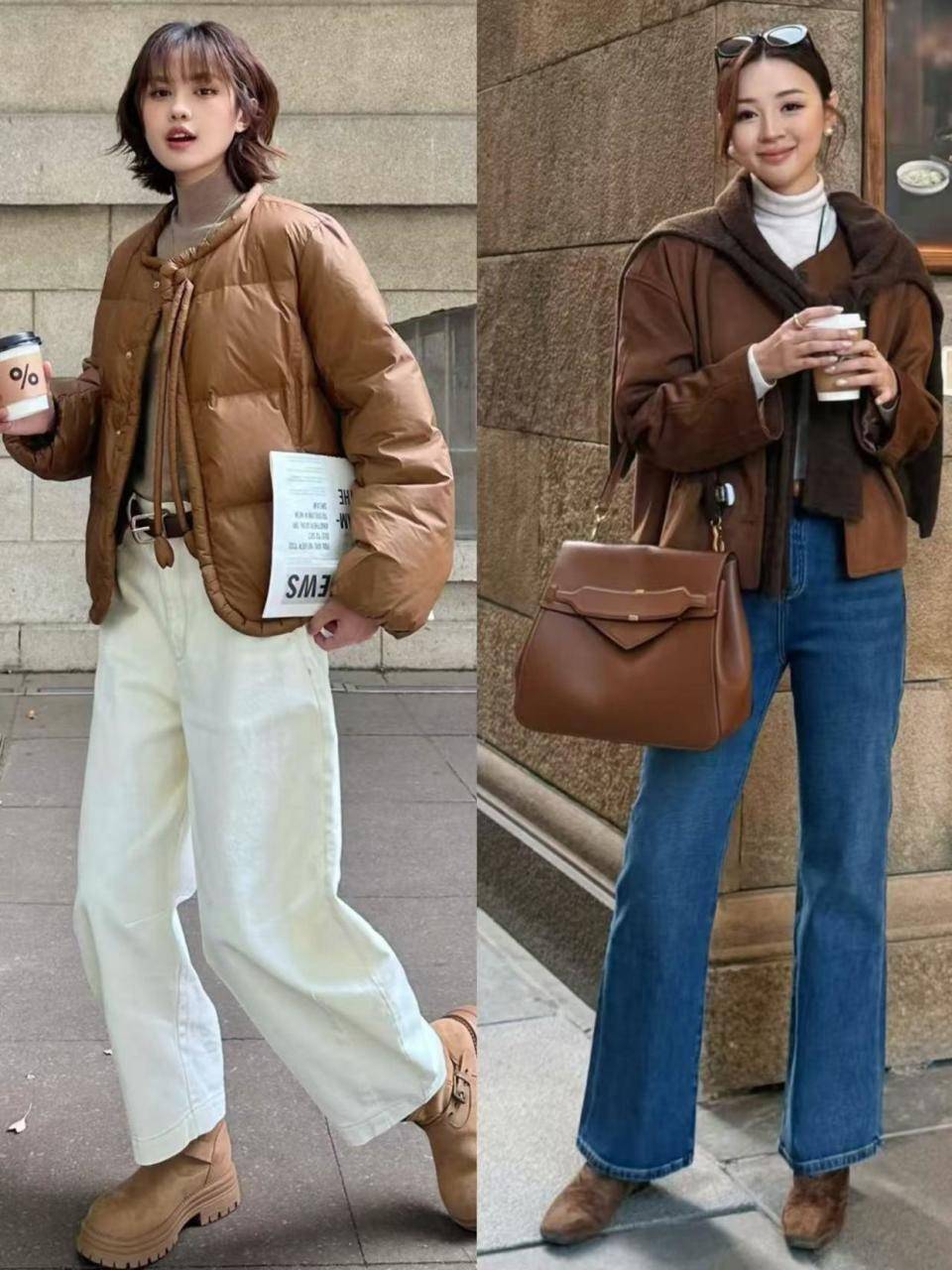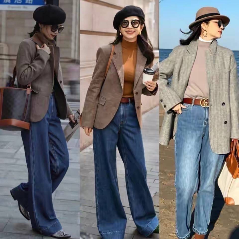 立冬之后早上和晚上温差比较大,可以选择上身之后就能保暖舒适的针织衣服单品,上面用一件浅驼色的西服,内搭深驼色的针织衫,加上一条牛仔阔腿裤,这样低饱和度的衣服色彩搭配,显得整个人比较有精气神,而且很有品质。