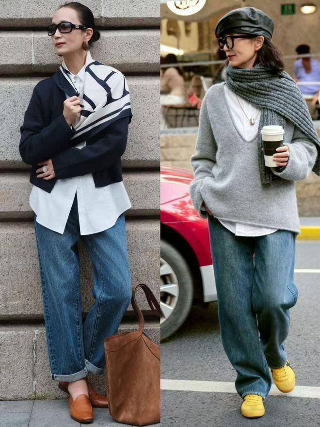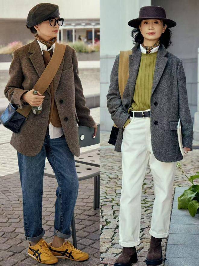 年龄在五六十岁的阶段,想让自己的穿搭简约洋气,你可以直接选择这种低饱和度的西装外套,内搭针织衫,叠加针织衫,再加上一条蓝色或者是白色的牛仔裤,脚上穿了一双黄色的德训鞋,或者是咖色的短靴,这样的穿衣造型看起来休闲又干练。